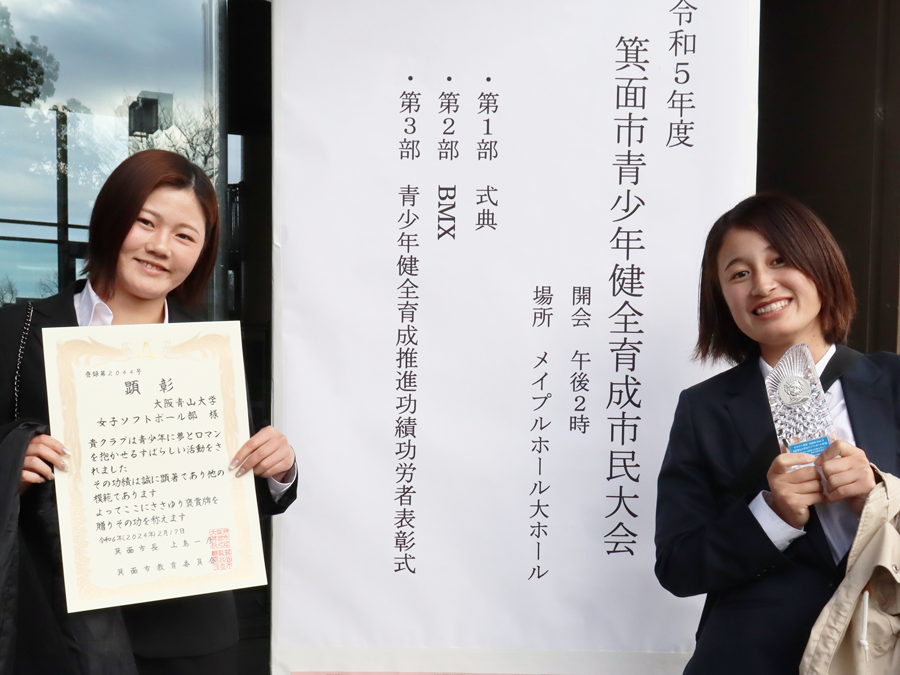 2024年2月17日(土)に行われた、箕面市青少年健全育成市民大会にて本学女子ソフトボール部がささゆり褒賞を受賞しました。ささゆり褒賞とはその年に箕面市の青少年のためになる、顕著な活動または青少年健全育成活動を積極的にした者に贈られます。
