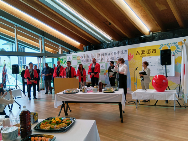 ハット市からはキャンベル・バリー(Campbell Barry)市長を含む十数名の訪問団が参加し、両市長の挨拶に続き、箕面市議会議長、ハット市のマナ・フェヌア(先住民マオリの土地権代表)の最高経営責任者、および在日ニュージーランド大使館公使からの祝辞が続きました。