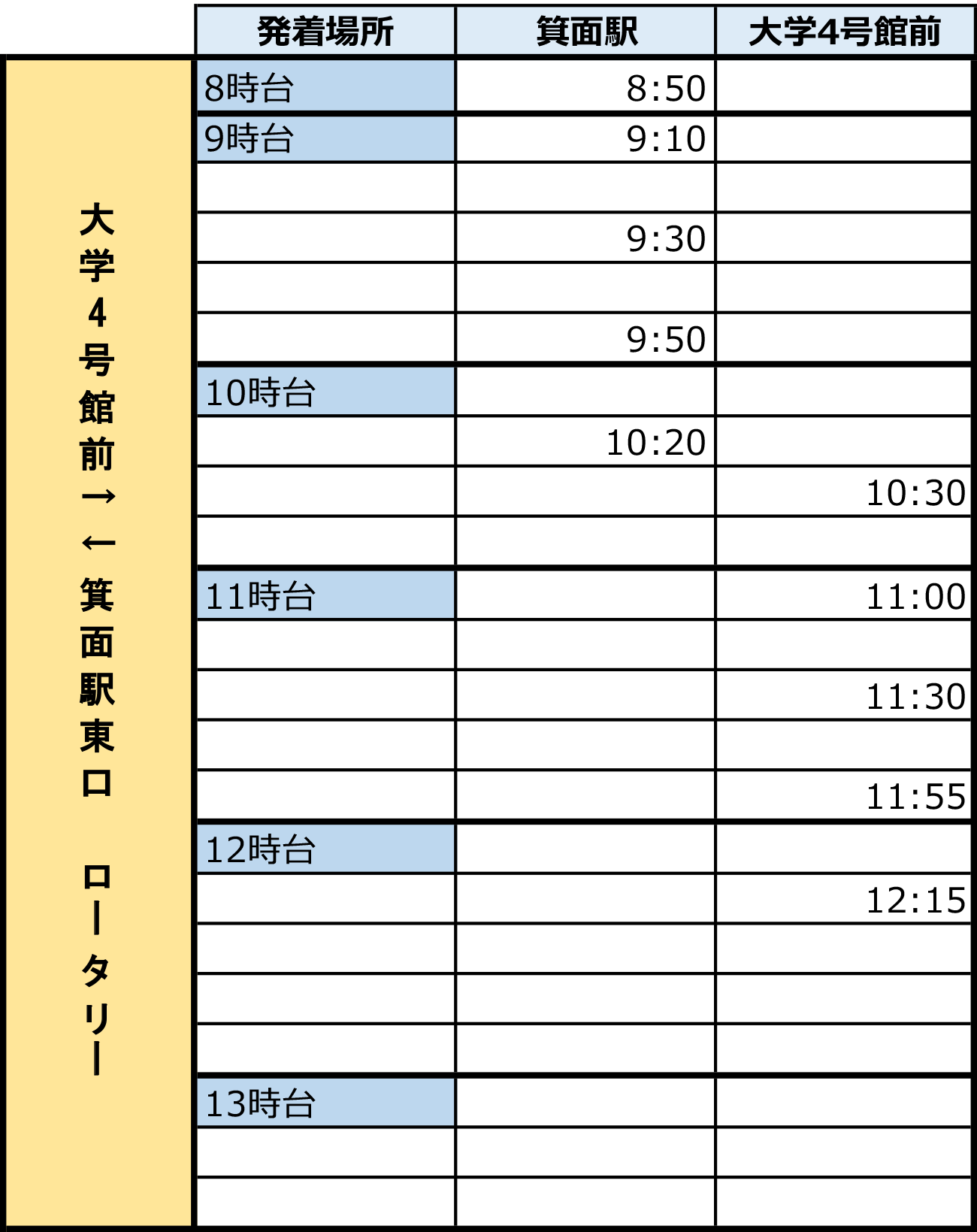 入学試験時のバスダイヤ:一般選抜 C 日程・総合型選抜 D 日程