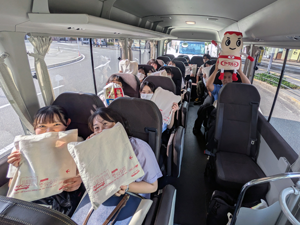 バスの道中では健康栄養学科卒業生の先輩 OG による企業説明 & アドバイスをしていただき、学生たちも実際の働き方や、学びがどう活かされるか等、積極的に質問をしました。