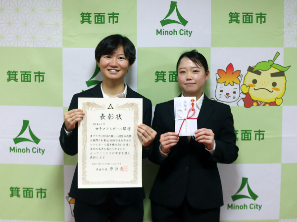 大阪青山大学女子ソフトボール部が、第 60 回全日本大学女子ソフトボール選手権大会に出場した栄誉を讃えられ、原田 亮 箕面市長より表彰を受けました。