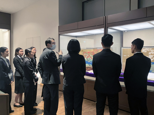 展示室に並べられた屏風や古文書などの文化財を観覧し、主任学芸員の小倉 教授による展示解説を聞きました。