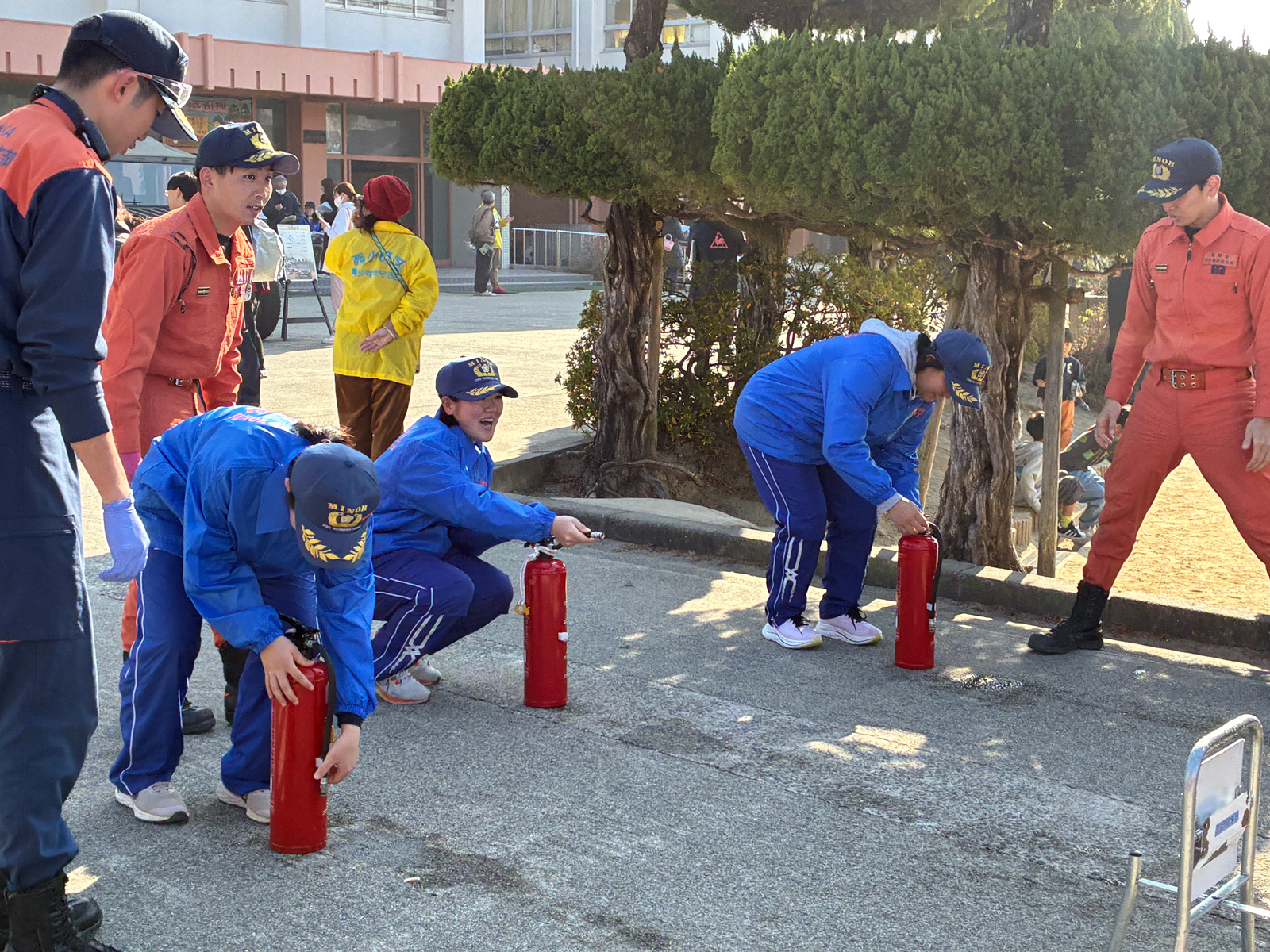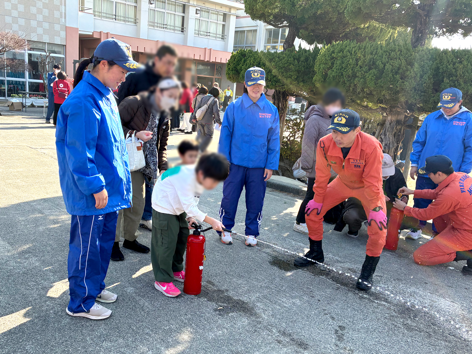 MATOYメンバーは消火器の使い方を学び、避難訓練に参加していた子どもたちにも丁寧に使い方を教えました。箕面市長である原田市長もお越しになり、一緒に水消火器体験に参加されました。