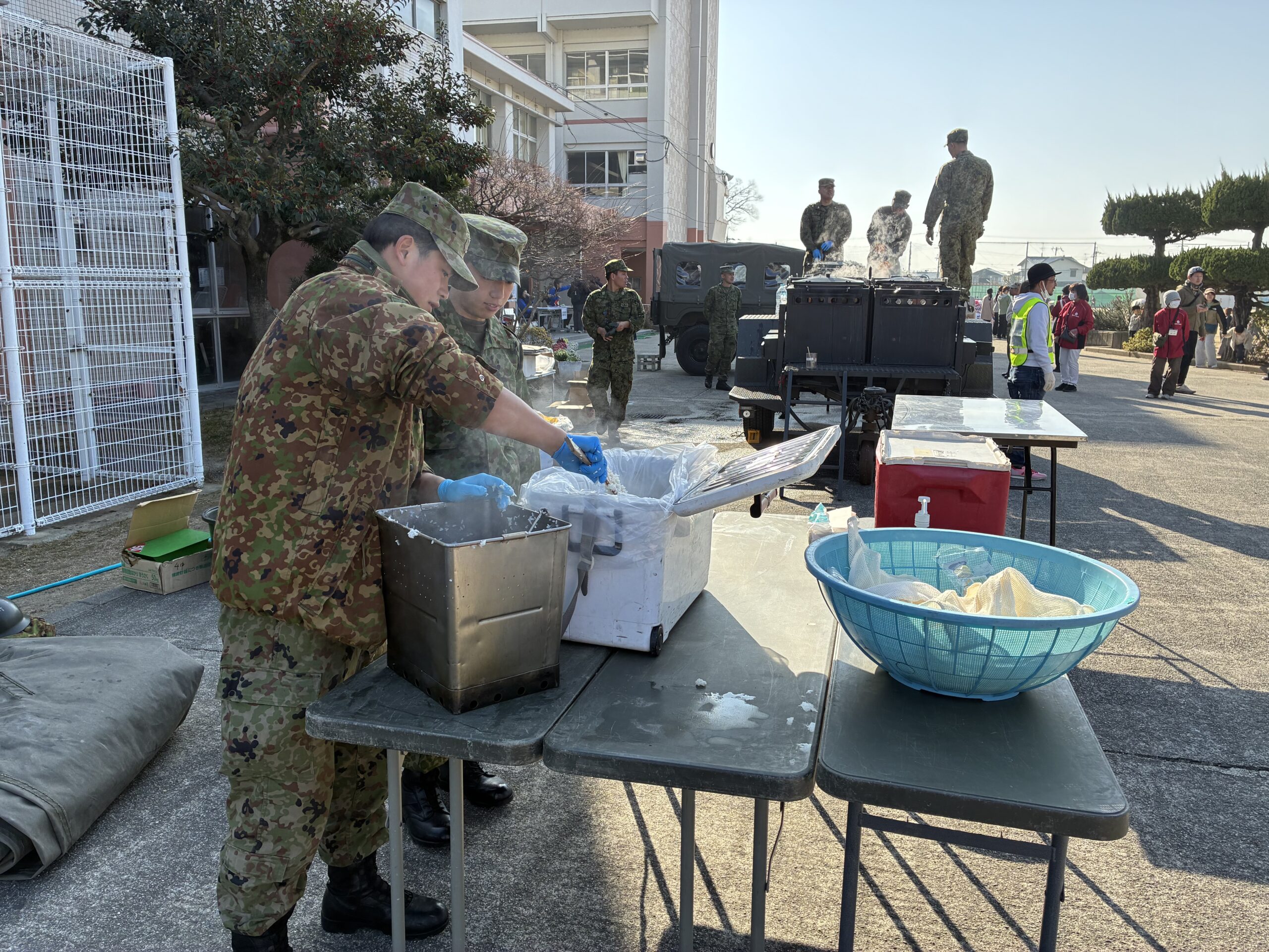 自衛隊の皆さんによるカレーライスの炊き出し訓練では、配給係として参加しました。避難してきた住民の方々にカレーライスを手渡しで配りましたが、カレーライスはとても美味しそうな香りがしていましたので、非常に長い列ができました。子どもたちを始め訓練に参加された皆さんは、きちんと順番に並んで美味しそうに食べていました。