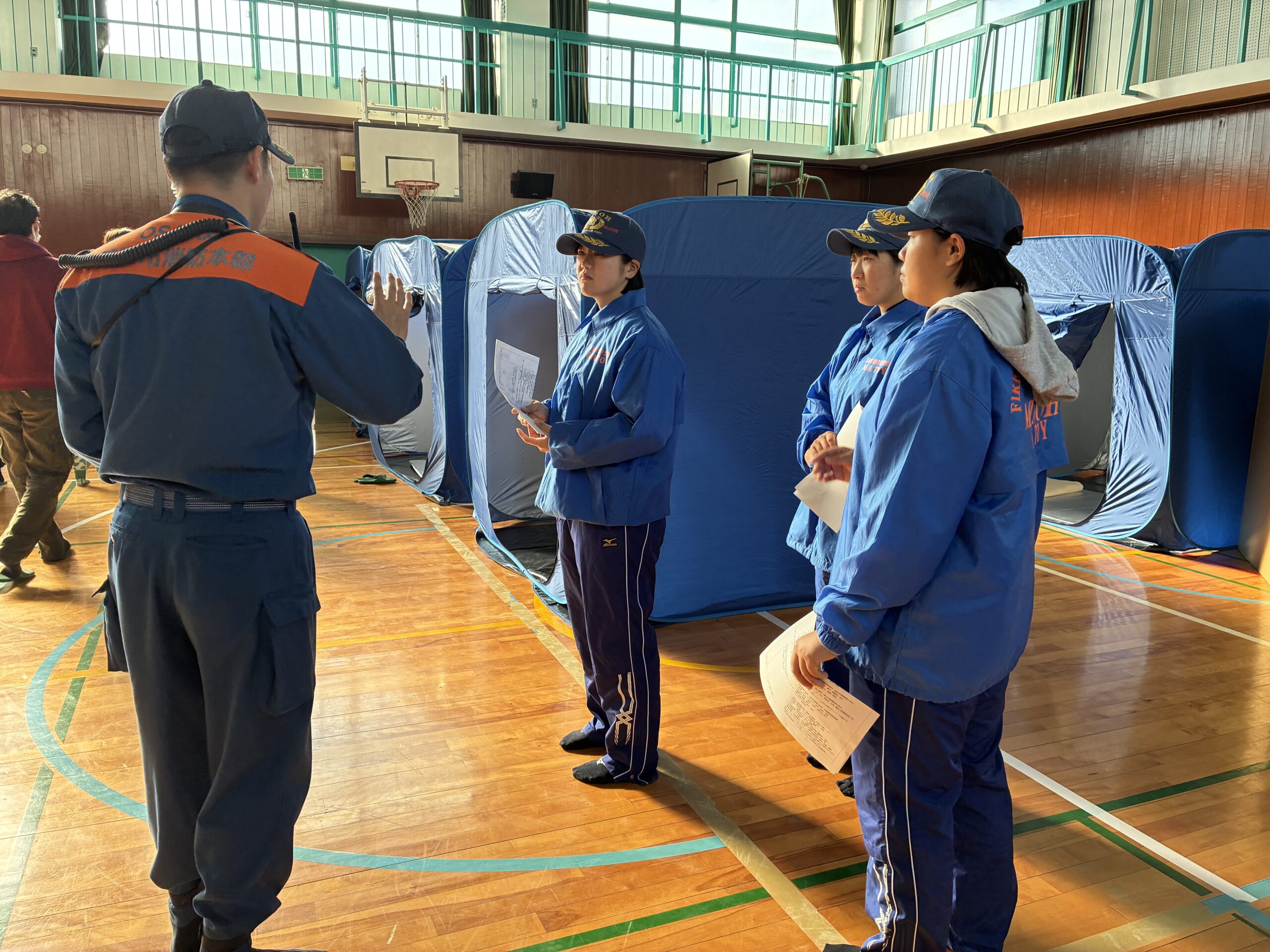 避難所となる箕面市立西小学校に到着すると、MATOYメンバーは消防隊員と一緒に各施設を巡りました。