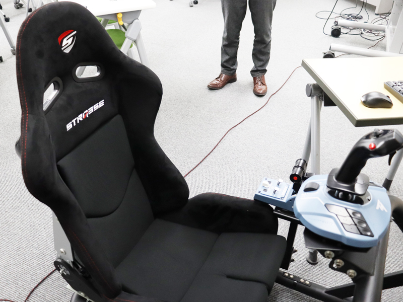 本学で学ぶ学生たちは将来小学校教員を目指すにあたり、ICTを活用した指導法を学修することができます。子ども教育学科が使用する「教職演習室」には様々なICT関連の設備を備えており、このフライトシミュレーターもその一つとして設置されました。