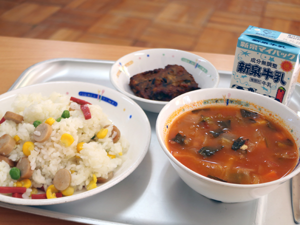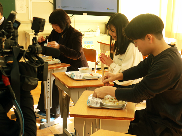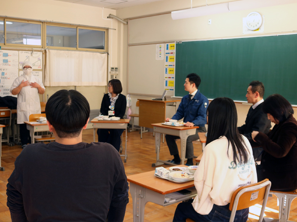 当日、現場の状況を少しでも体感したいという本学の学生・教員の希望を受け、市内の小学校での試食と見学の場を設けていただきました。