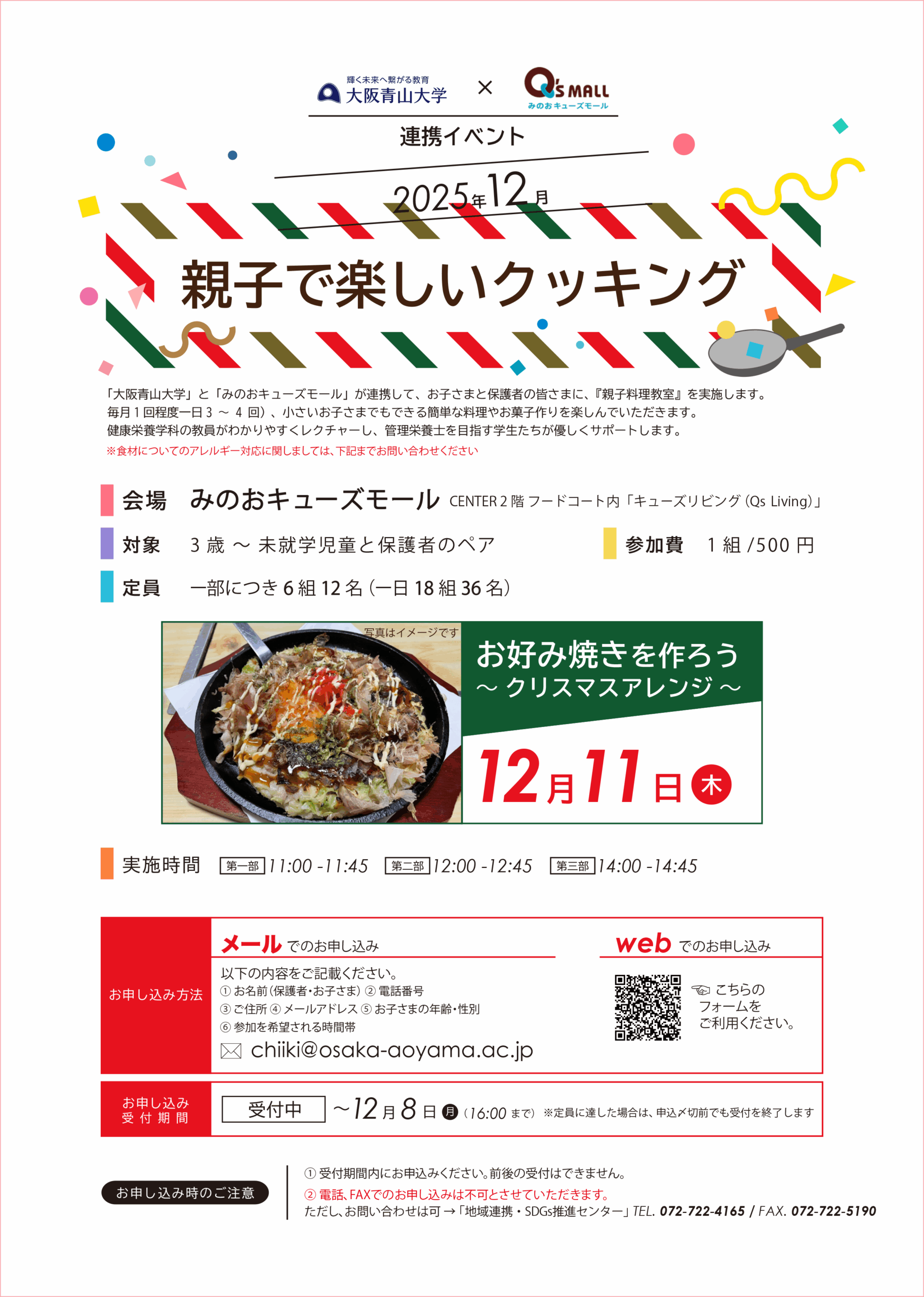 | 2025 年 12 月 11 日(木) | 受付中 〜 12 月 8 日(月) | お好み焼きを作ろう クリスマスアレンジ |