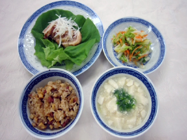 今回は、電子レンジで簡単にできる中華風おこわや、鶏肉ロールを含む全4品を実習します。この調理実習は健康栄養学科2年次・食育コースの授業の一環として行います。学生は参加者の方の季節ごとの行事食や、思い出の食に関するエピソードをお聞かせいただき、いろいろな年代やご家庭の食生活について見聞を深め今後の管理栄養士としての資質の向上を目指します。ぜひ学生の教育にご協力ください。