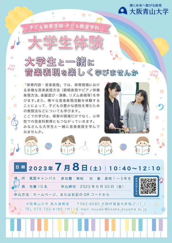 大阪青山大学の専門分野の中でテーマに沿った連続授業を経験し、食堂でのランチやクラブ・サークル活動の見学、大学生との交流などキャンパスライフの一端にもふれることができる、一日体験入学です。
