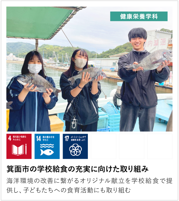 本学は、創立者が「教育の充実」というコンセプトを掲げ、1967 年に幼稚園と短期大学(幼児教育科・家政科)からなる学校法人を設立しました。以来、建学の精神「高い知性と学識と豊かな情操を兼ね備えた品位ある人材の育成」の考えのもと、倫理性と創造性をもって社会の一員として活躍できる、またグローバルな視点をもって地域社会に貢献できる人材を育成することを教育目標として掲げています。2005 年に大阪青山大学を開学し、食と栄養、保育・教育、看護、福祉などの分野の教育・研究を進める現在においても、開学時の強い思いは引き継がれ、それはまさに SDGs の考え方そのものに繋がるものです。