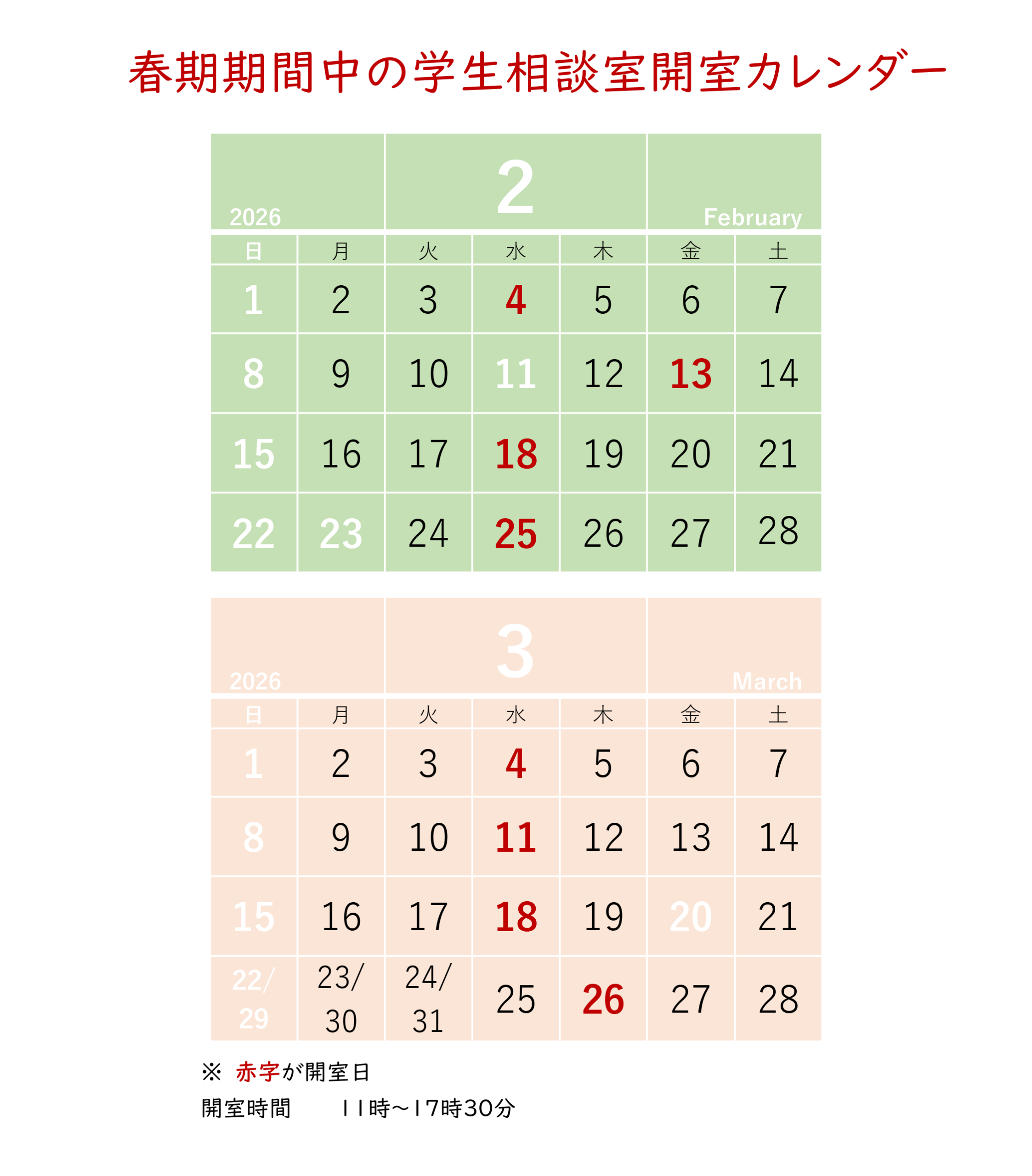 ・これまで通り、相談室に直接来室(空いていればすぐ相談できます)か、学生支援センター、保健室での予約も受け付けています。