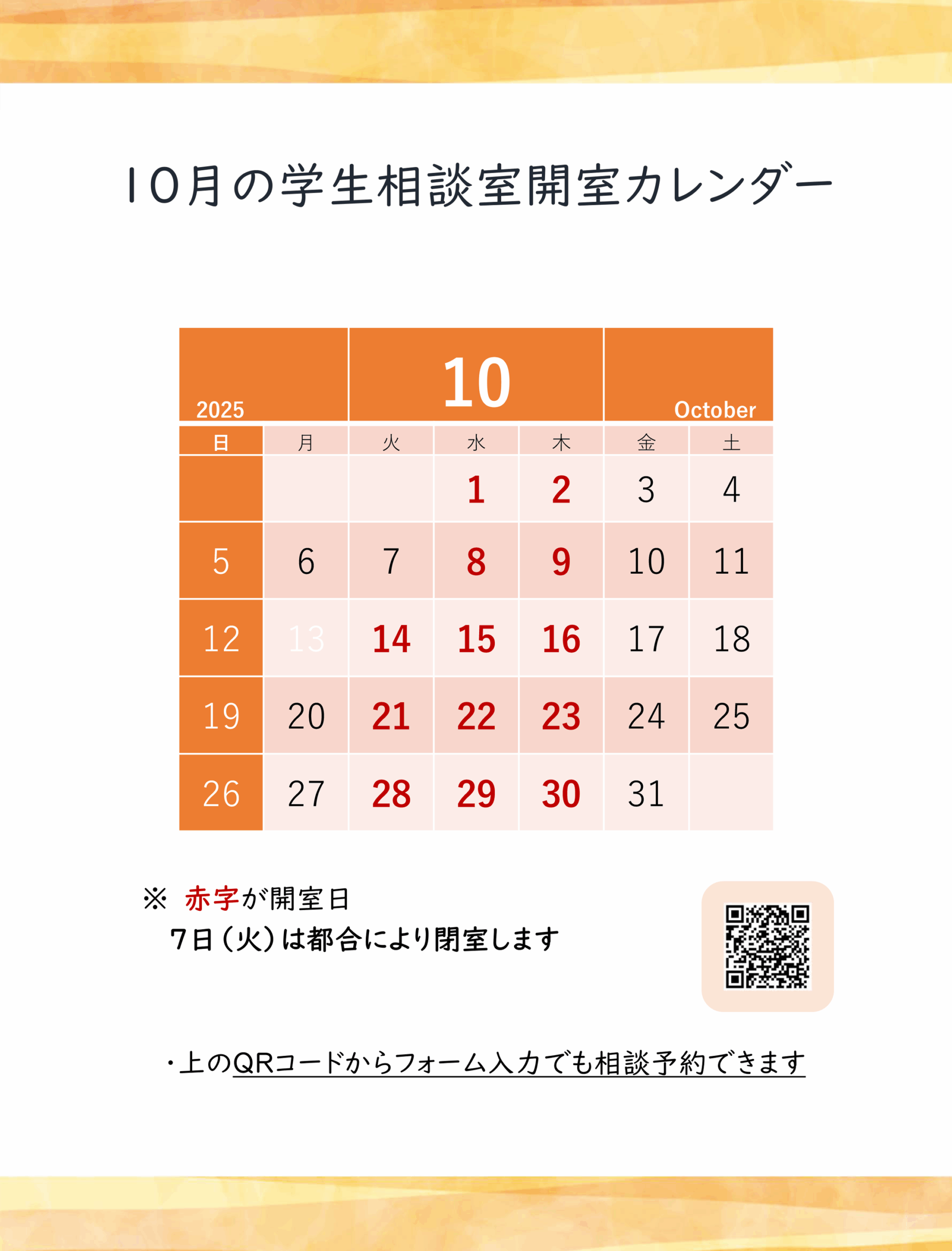 ・これまで通り、相談室に直接来室(空いていればすぐ相談できます)か、学生支援センター、保健室での予約も受け付けています。