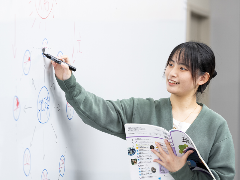 初等教育コースでは、指導案の作成から場面指導、模擬授業の実施まで、実践的な学びにたくさん取り組みます。実際にやってみると色々な課題が見えてきて難しさを実感しますが、トライアンドエラーを繰り返し、しっかりと準備をして臨んだ教育実習では、多くの学びを得られました。