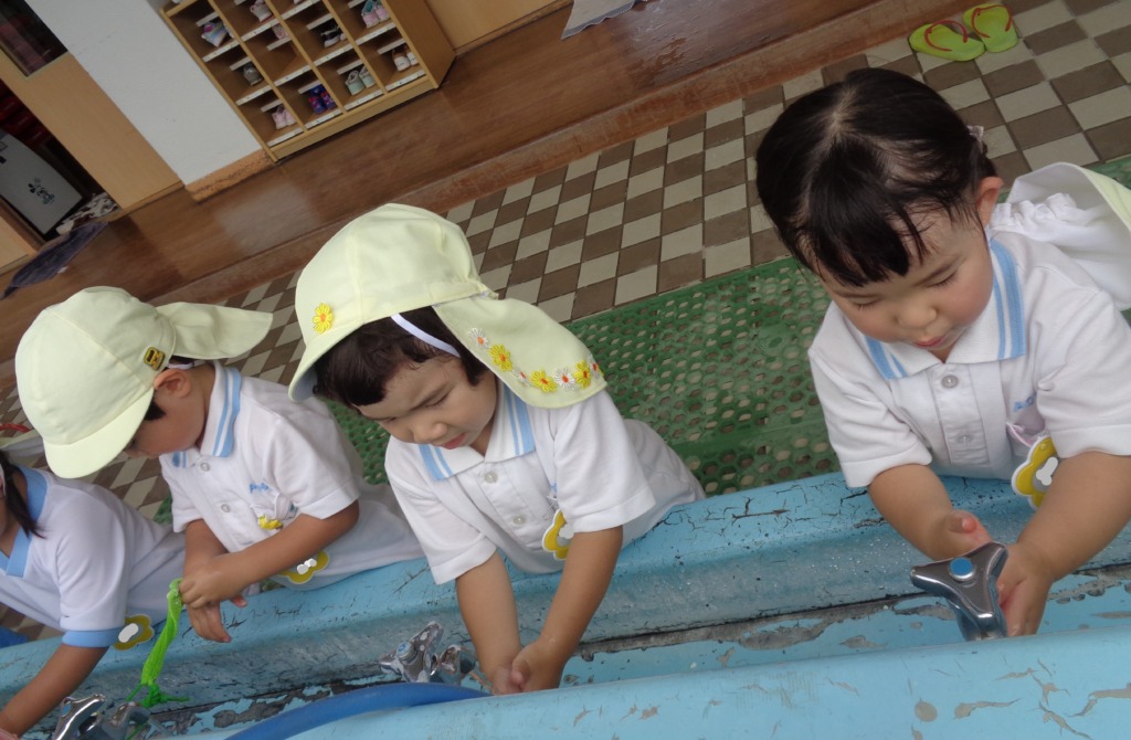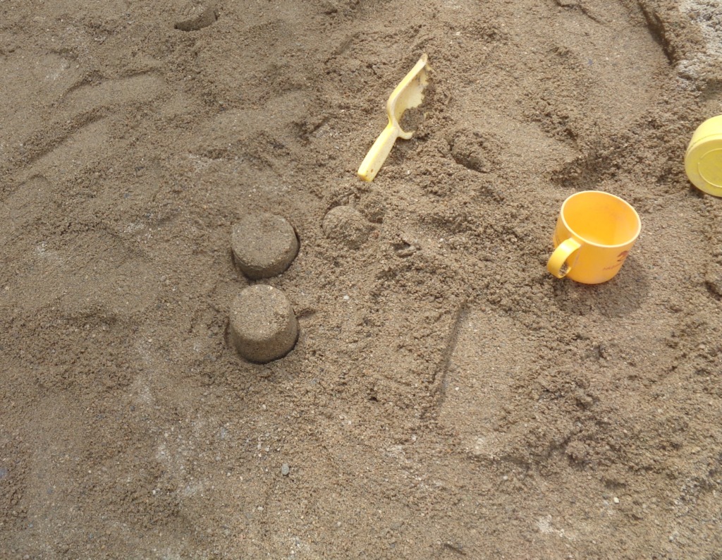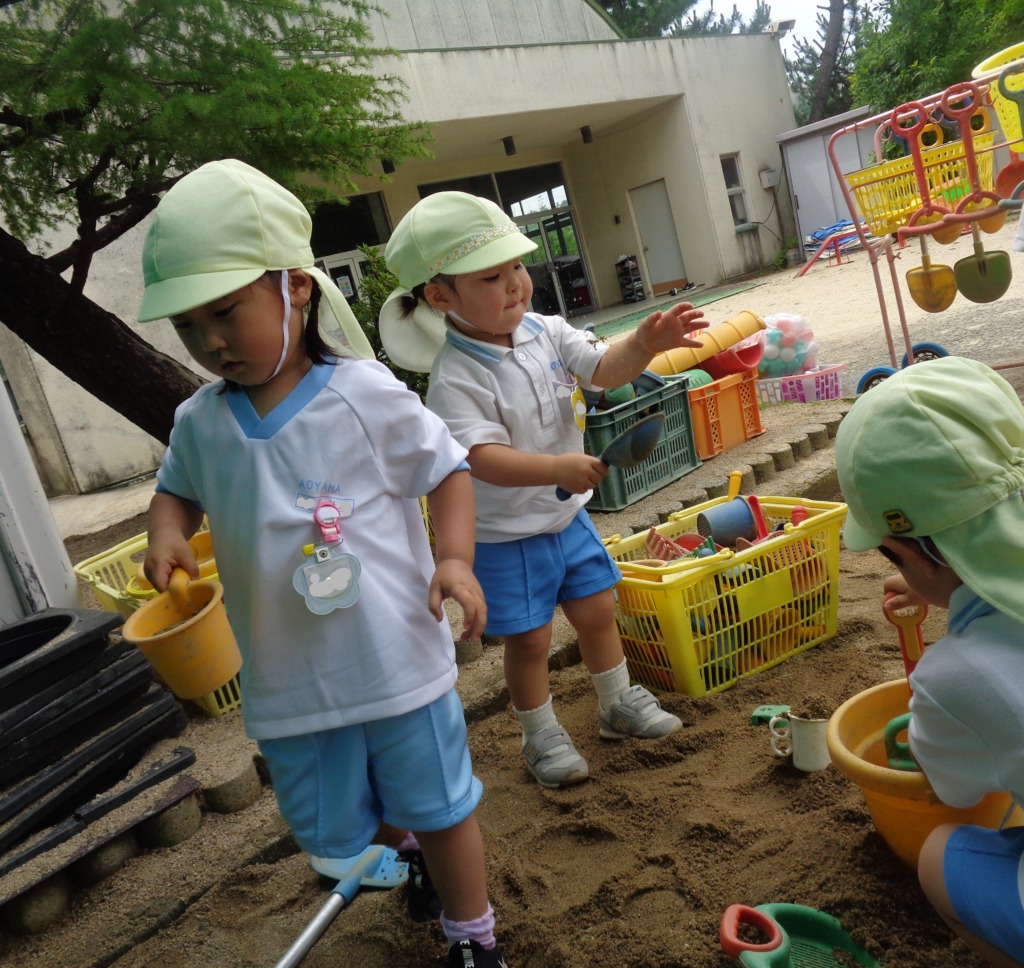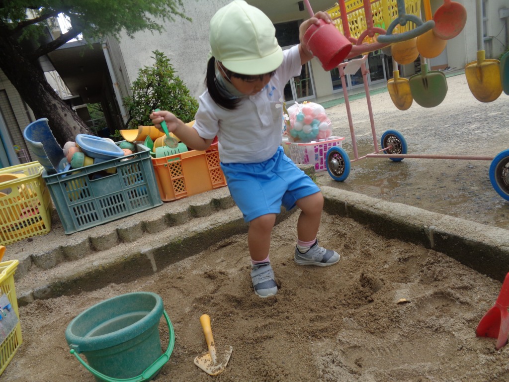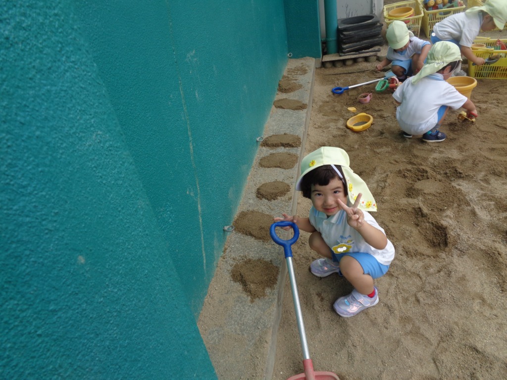 砂場では、カップに砂をたくさん入れてからひっくり返してプリン作りを楽しみました。