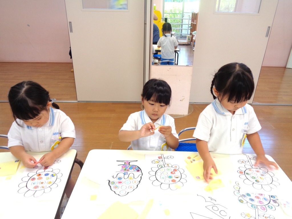 初めはシールを台紙からはがすことに苦戦する姿もありましたが、慣れてくるとどんどんあたらしい用紙をもらいにきて、ペタペタ・・・・と真剣なお顔で集中していましたよ。
