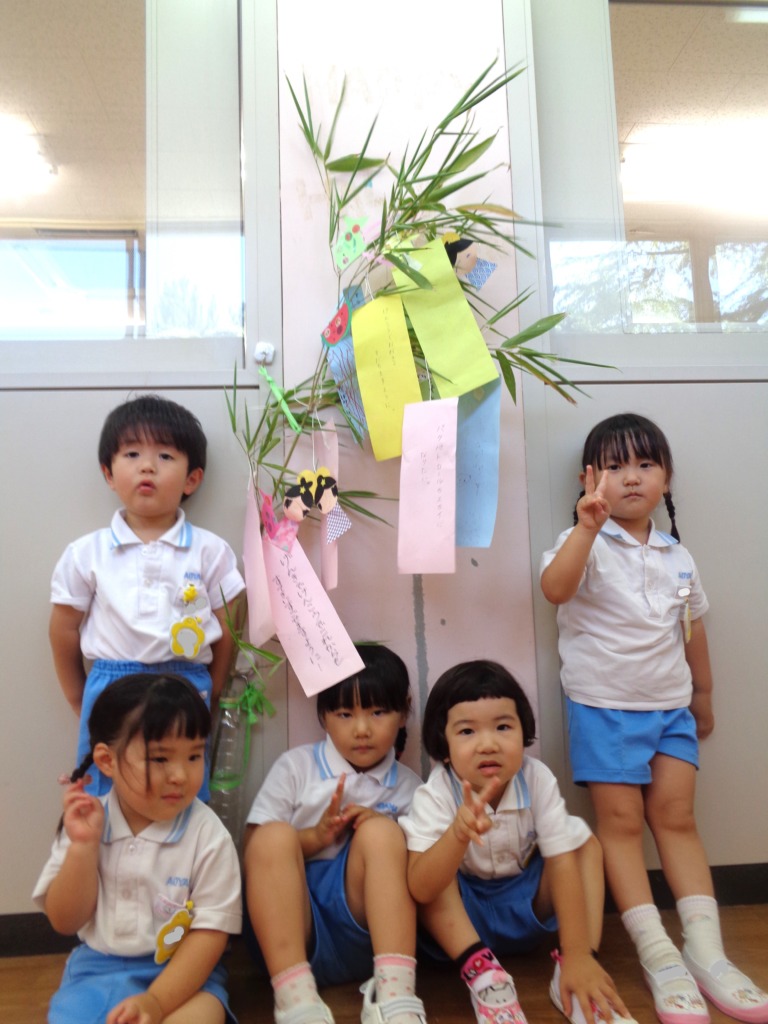 各クラスそれぞれのお部屋に笹をかざっているので、幼稚園探検をしながら笹飾りを見てまわりました。