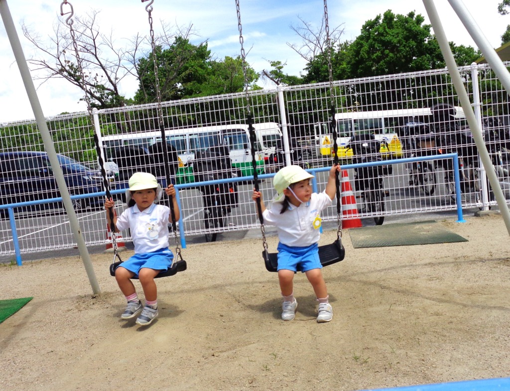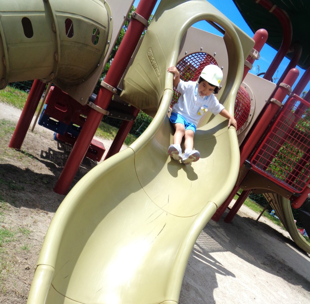 朝は運動場で遊びました。「げんきーず」のトンネルやクネクネすべり台を楽しんでいました。