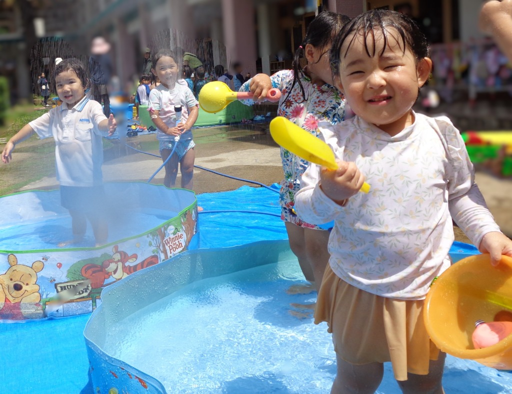 顔が濡れることが苦手な子もいますが、「もっと雨ふらせてー!」とシャワーをせがむ子どもたち。