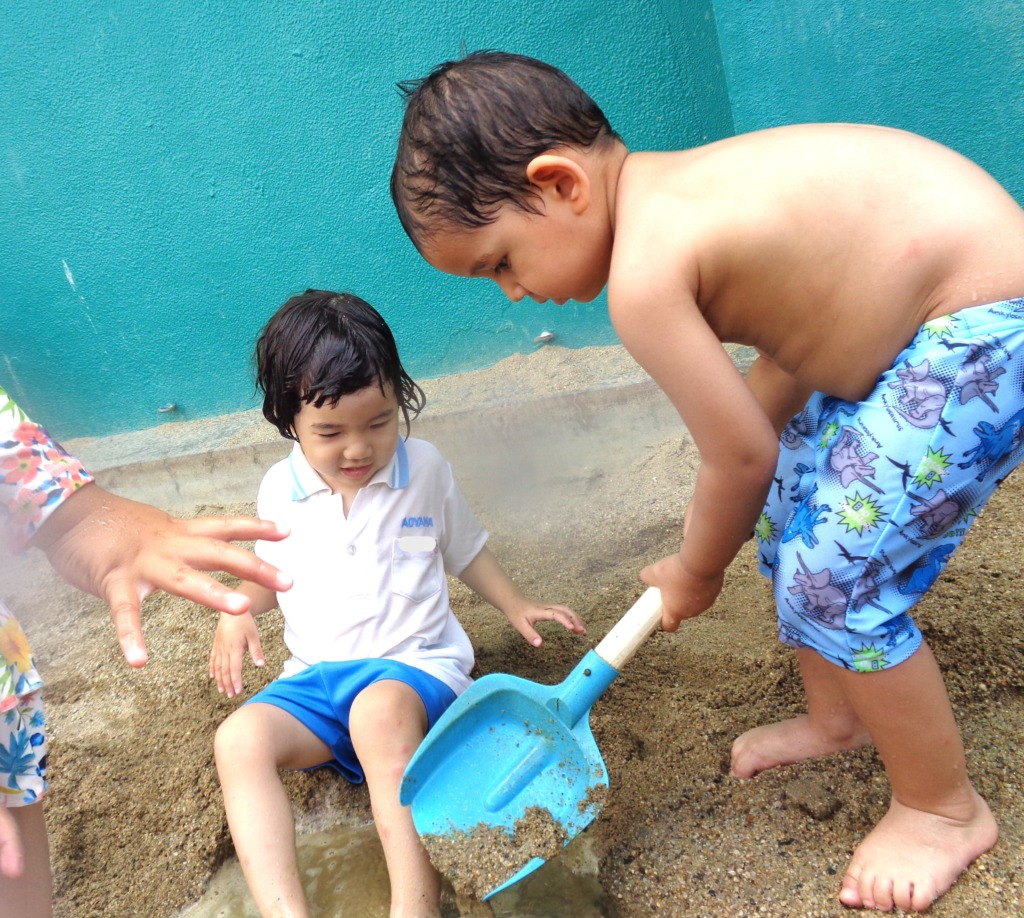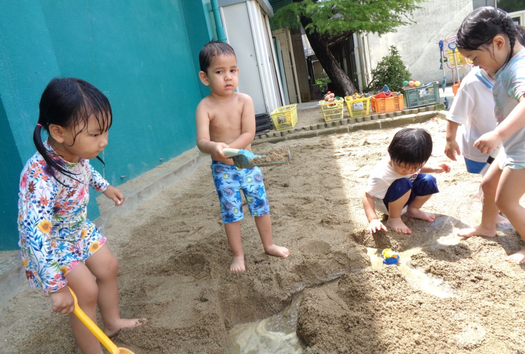 砂場で穴掘りをしたり、水路をつくって水を流したり、水をためたところで「おふろ入るね」と座ってみたり。