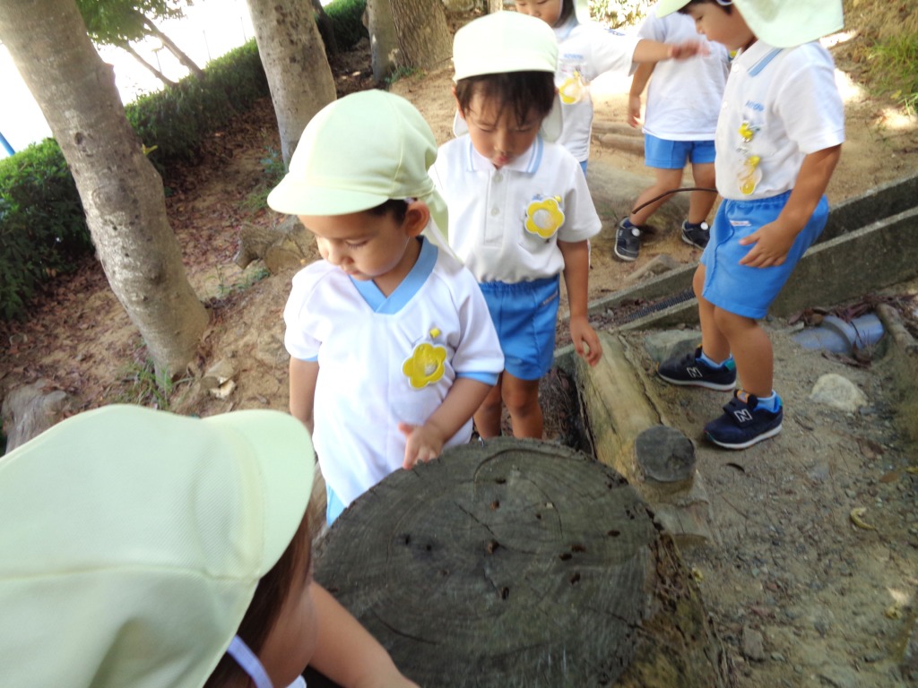 他には切り株や土に穴を発見して、枝でほじったり、じいっと観察する姿がありました。
