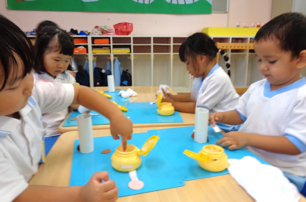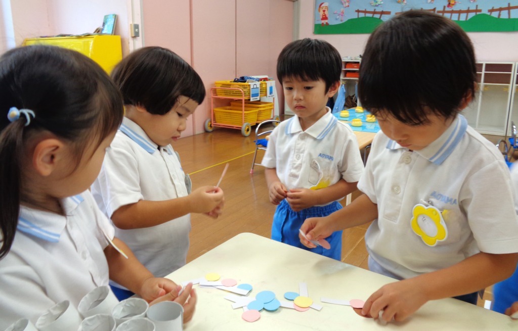 保育者に手伝ってもらいながら、トイレットペーパーの芯に