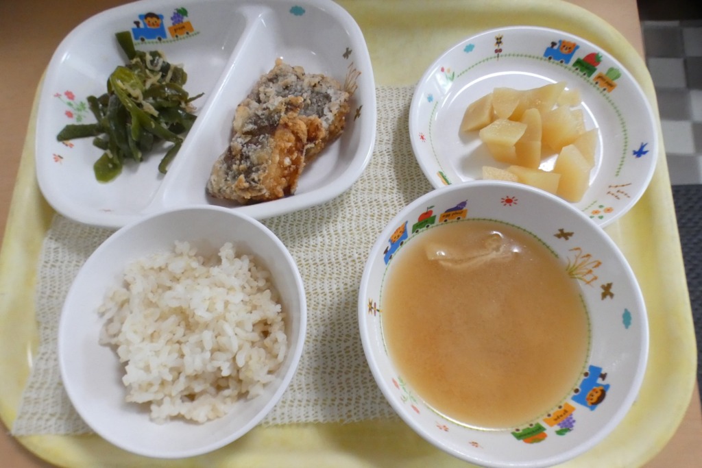 ・ご飯・カレイの唐揚げ・じゃこピーマン炒め
