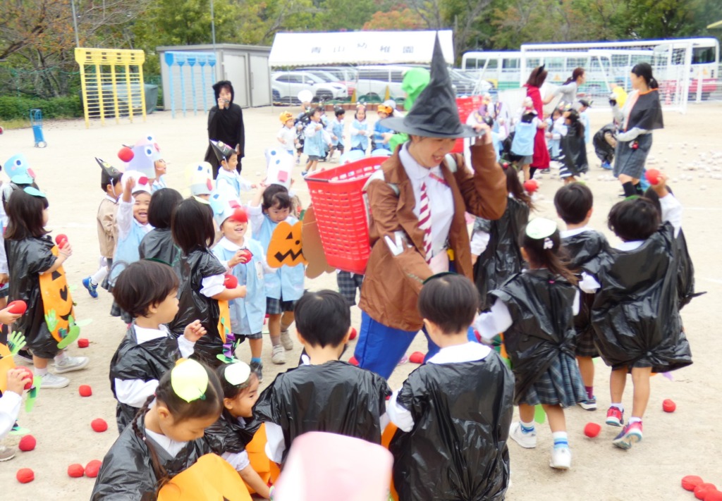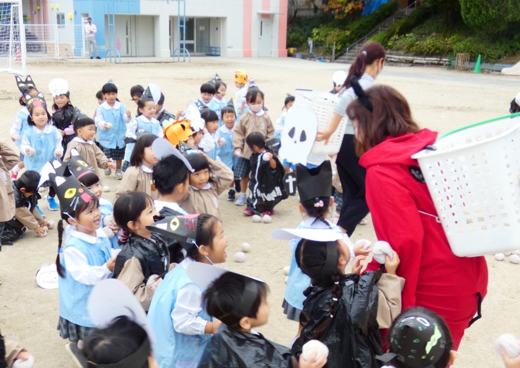 年少組が各クラスそれぞれの衣装で仮装し、運動場で遊びました。