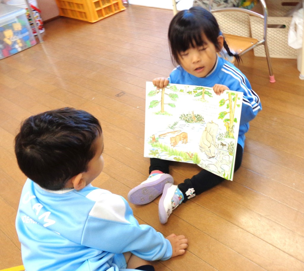 帰りの活動の前に絵本をみました。