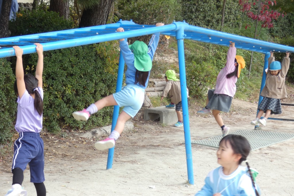 運動場を見ていると、こどもたちは今日も好きな遊びを楽しんでいました。色々な所から声がかかります。「先生~!うんていできるから見といて~!!」と聞こえてきたので、うんていを見にきました。何度もなんども一生懸命挑戦している姿に胸が熱くなりました☆