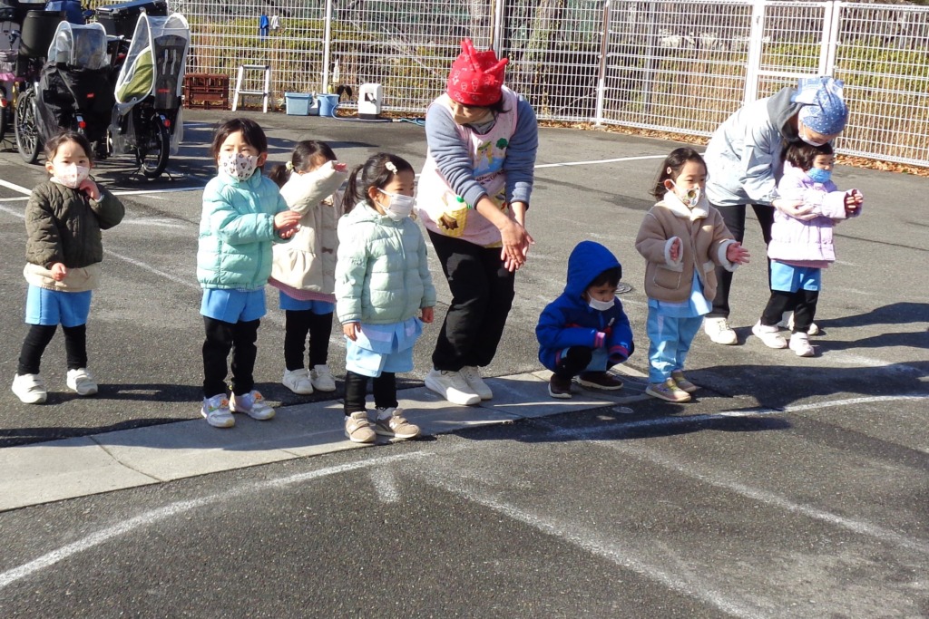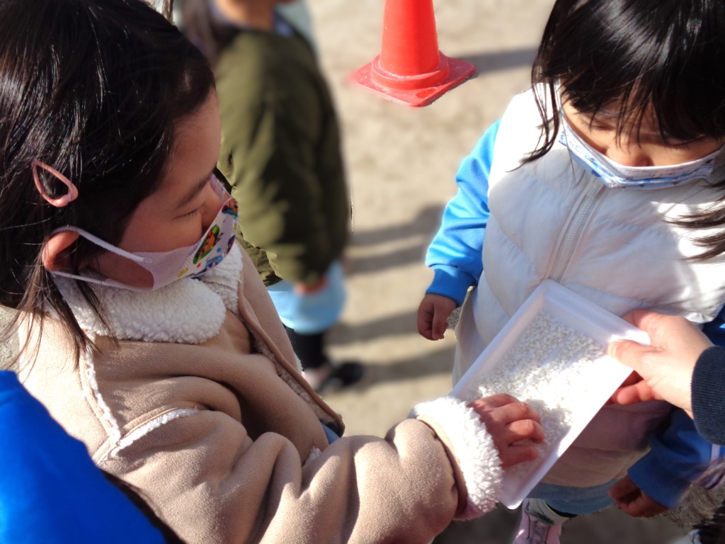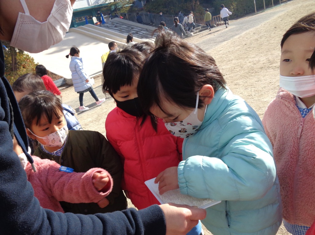 登園してきた子どもたちは「なんだろう?」「あそこにおもちが入ってるの?」と