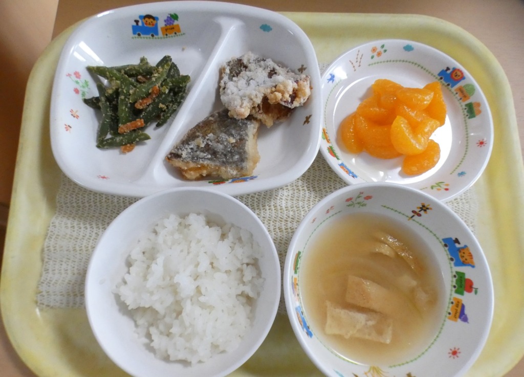 ・ご飯・カレイの唐揚げ・いんげんの胡麻和え