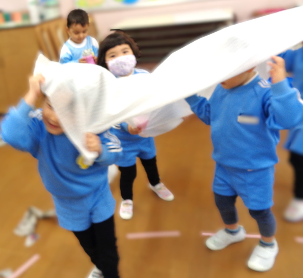 新聞紙あそびでは、ふとんに見立てて肩までかぶってみたり