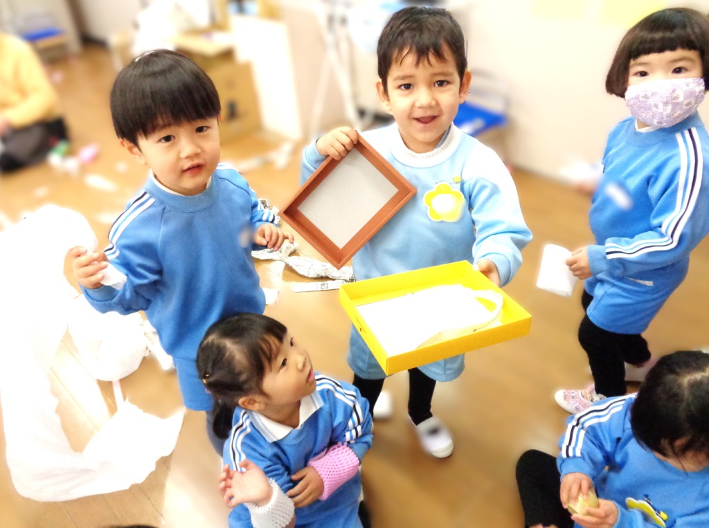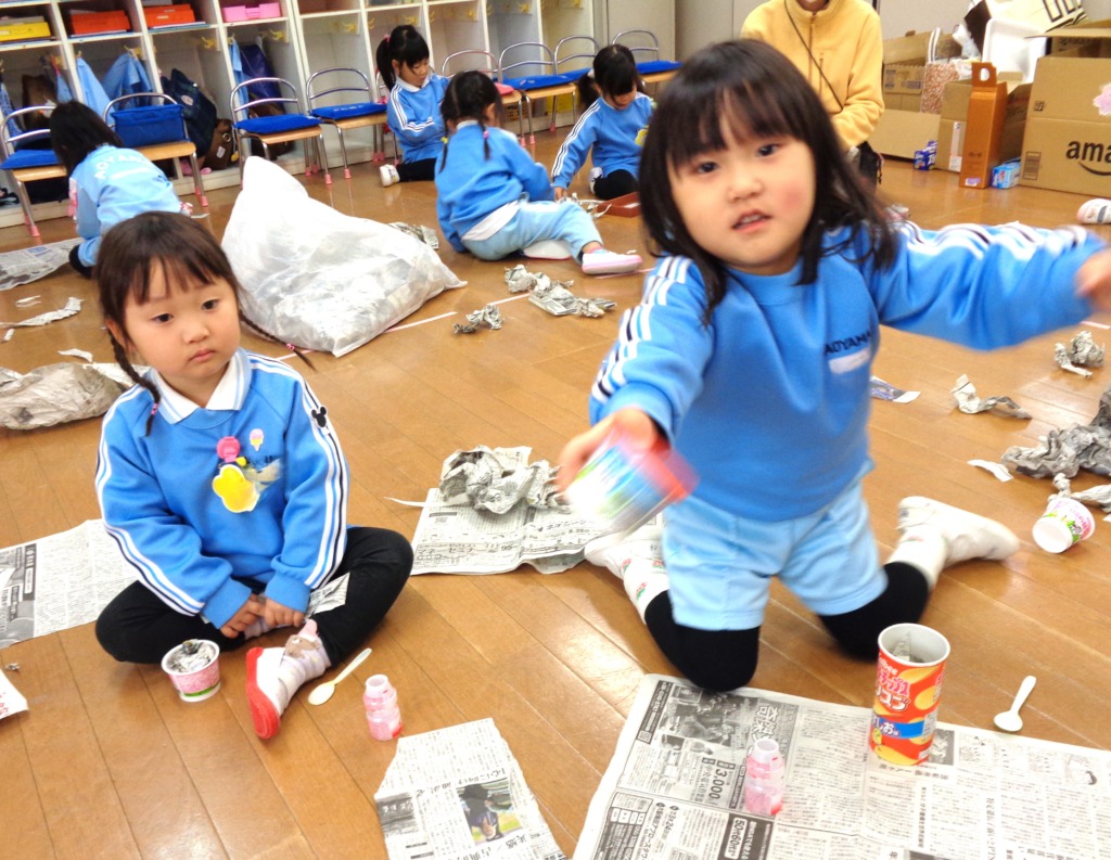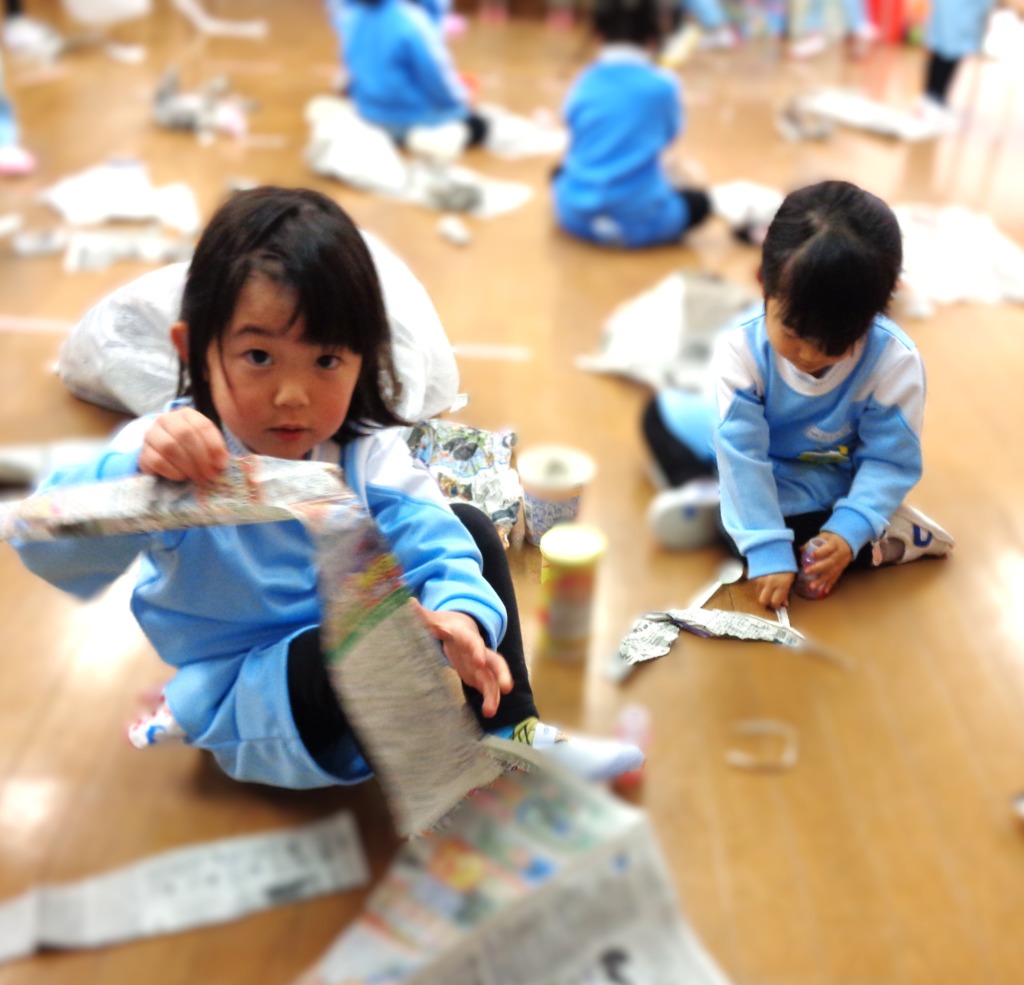 新聞紙プラス廃品を使い、いろいろな楽しみ方ができ遊びがひろがりました☆彡