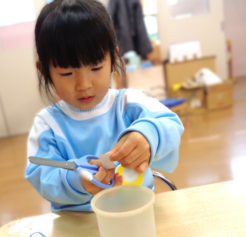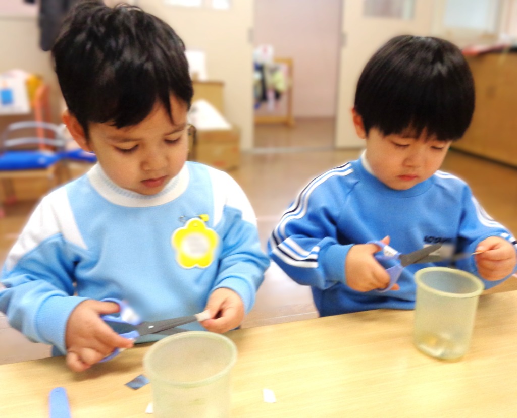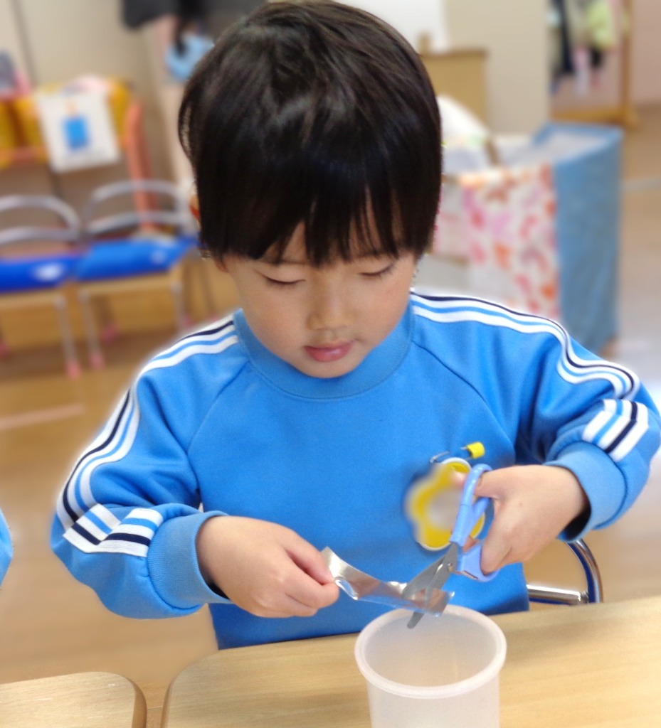 はさみで「ぱっくん、ぱっくん」の1回切りをしました。