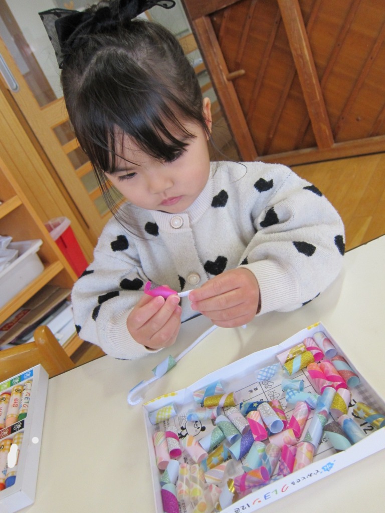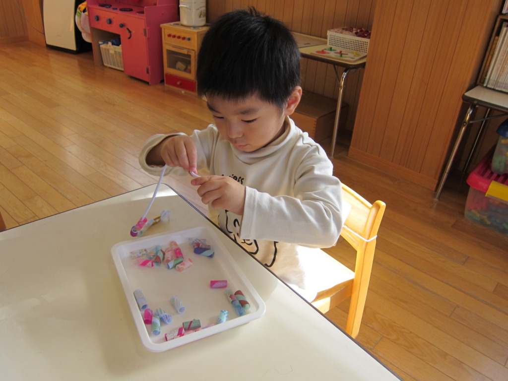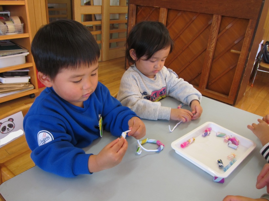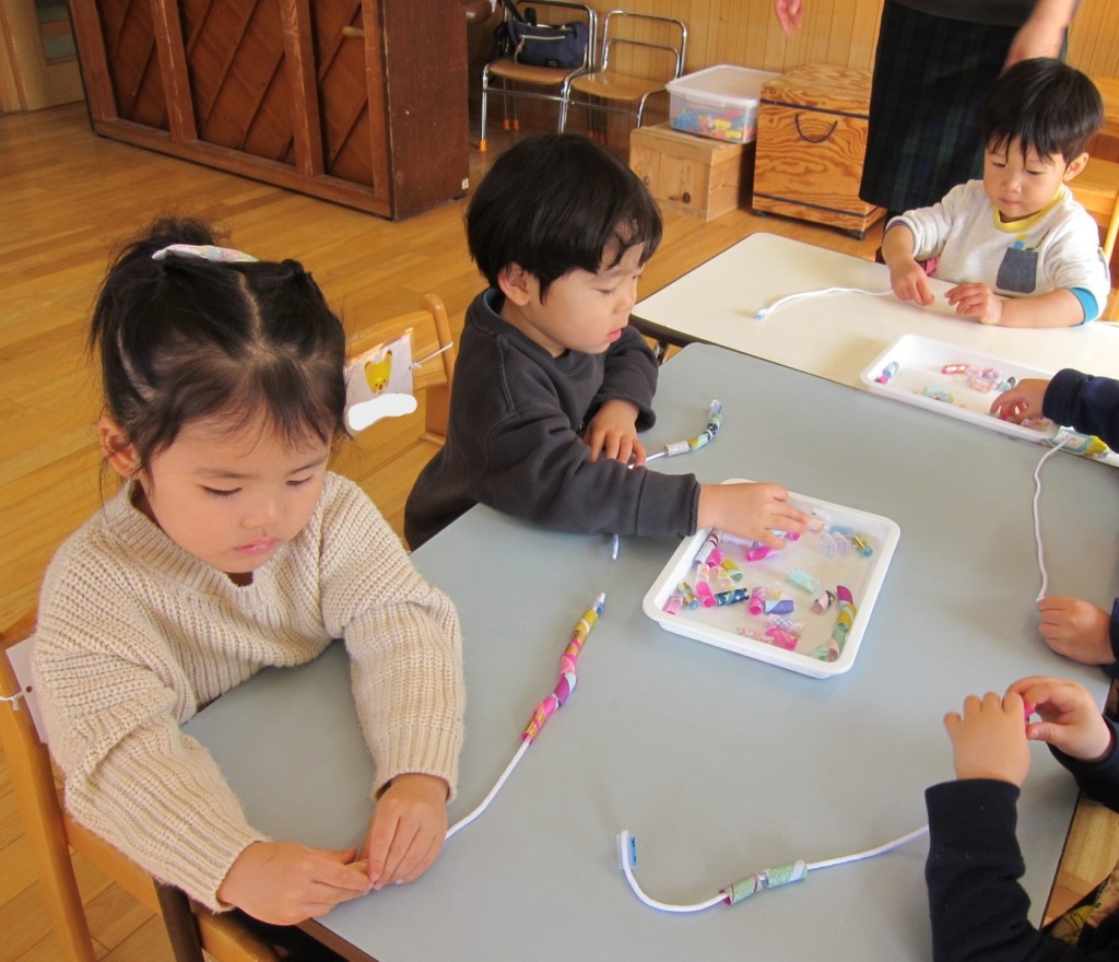一つ一つ丁寧に紐を通していました。