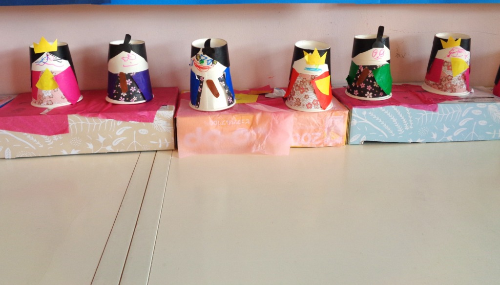 おひなさまの台座に色紙などを貼ってきれいにしました。