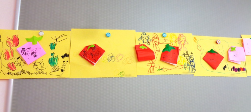 子どもたちからは「イチゴ電車みたーい!」と言われた作品です。