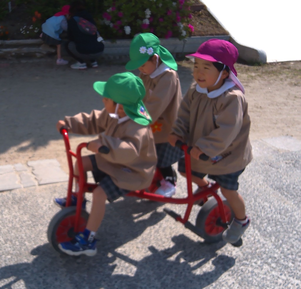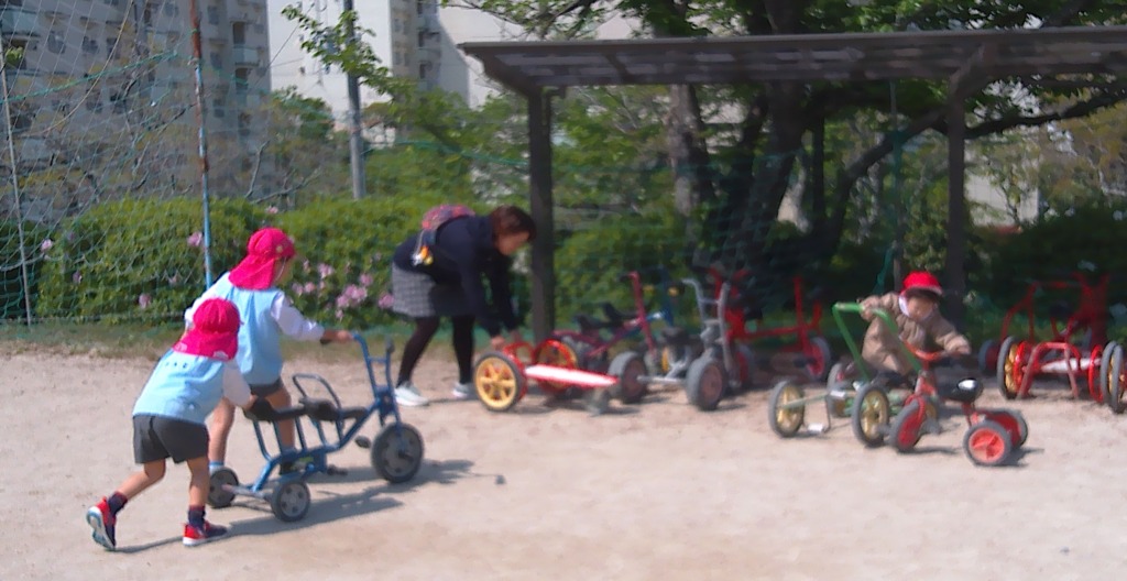 月曜日の朝礼で使い方を教えてもらった三輪車でさっそく遊ぶ姿がみられました♬一人で乗ったり友だちと乗ったりとても楽しそうでした(≧▽≦)