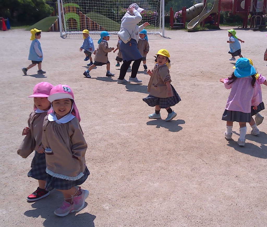 保育が始まると年少組さんはみんなで運動場に出て来て遊んでいました(^^)音楽が鳴っている間、自由に散歩して音楽が止まると止まる遊びをしたり、先生の所に集まる遊びを楽しんでいました♬