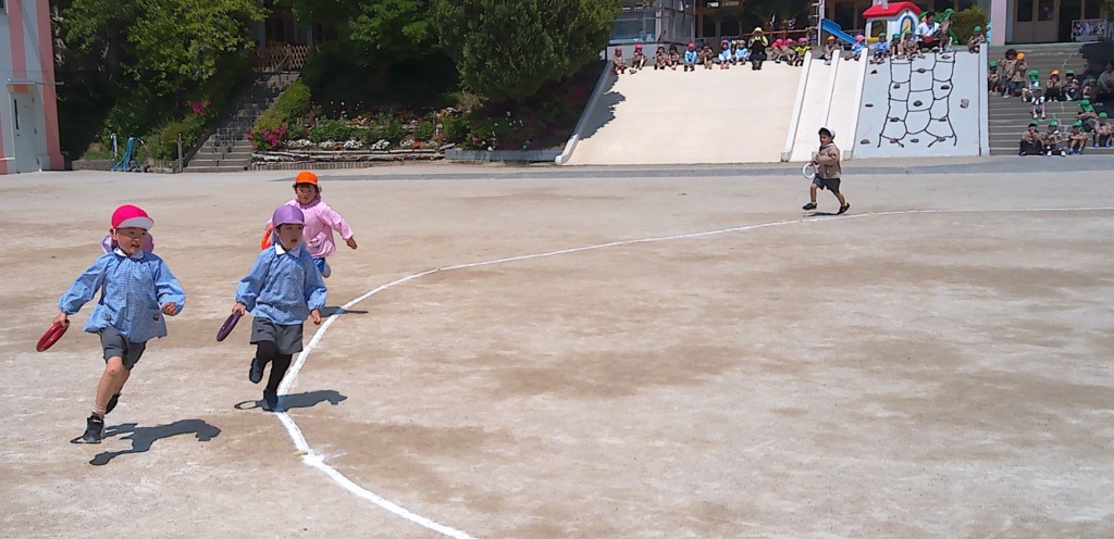 お弁当を食べ、お昼から運動場に出ると年長組さんが外に出てきていました。何をするのか見ていると…毎回白熱するリレーがおこなわれていました!!各クラス1位を目指して今日が初めてのレース…見ている僕もいつのまにか声をあげて応援していました!!!勝ったクラスも負けたクラスもこれから色々な作戦を立てて、力を合わせて1位を目指してほしいです!(^^)!