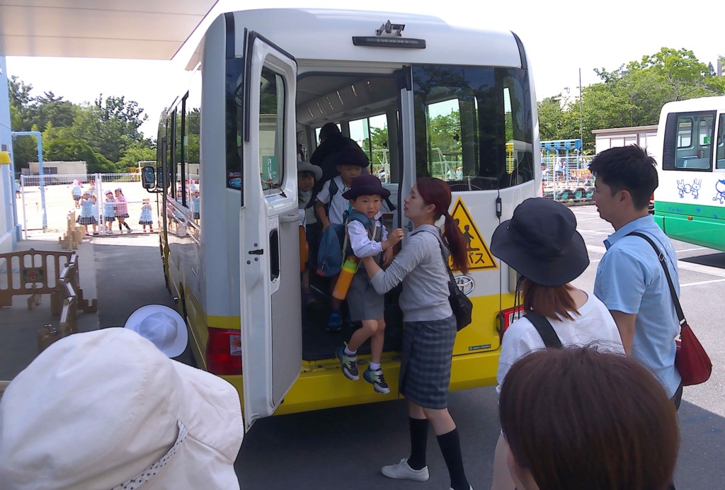 今日はバスの避難訓練をおこないました。バスに乗っている時も何が起きるか分かりません!バスに添乗中に何かが起こったと仮定して、いつもと違う非常用ドアから先生に抱えられて降りました。