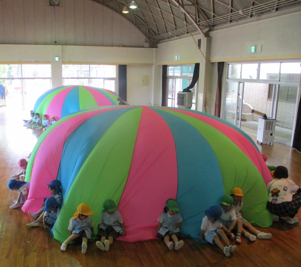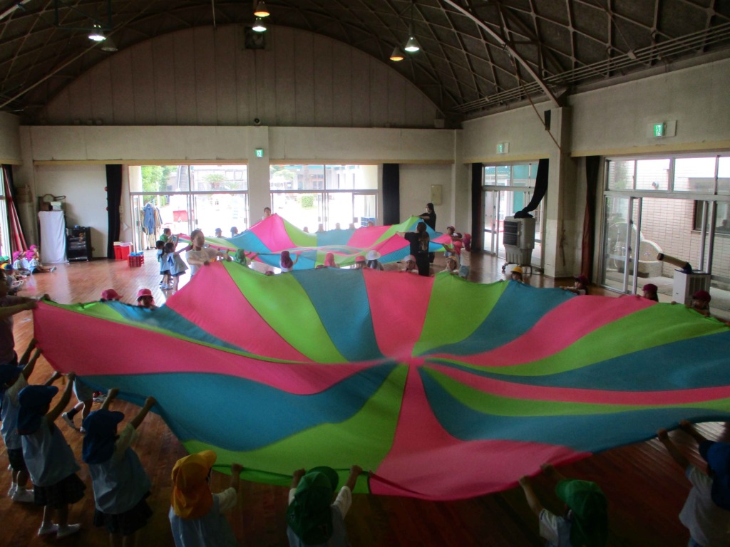 お昼からは年中組がリズム室でパラバルーンをおこなっていました(*^^*)色々な技を覚え、曲に合わせておこなっていました(*^_^*)とっても上手でしたよ☆