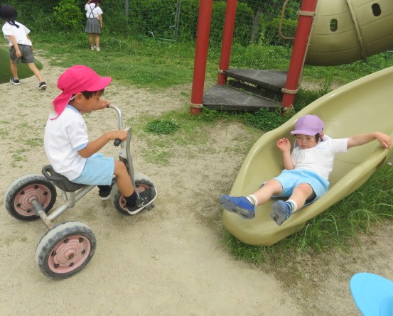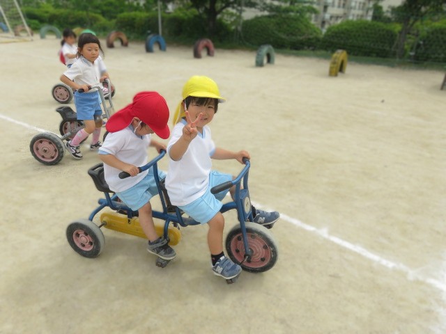 外遊びでは、三輪車やスケーター、新しく増えたボールでサッカーなどが人気です!