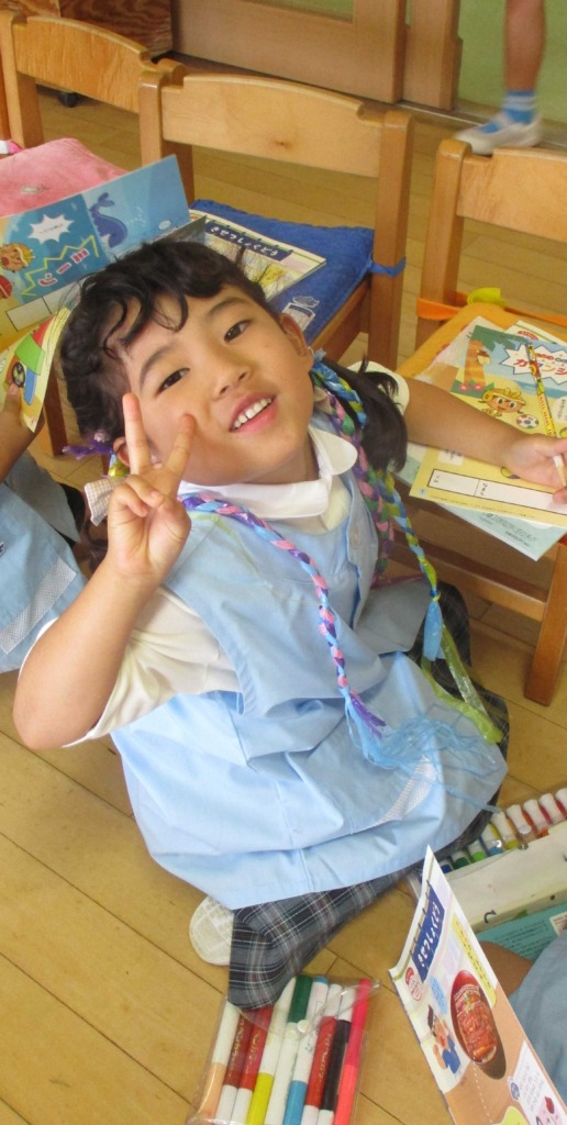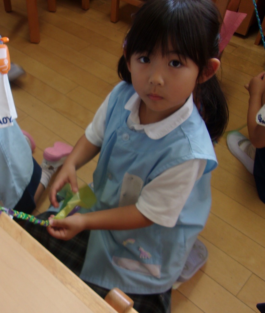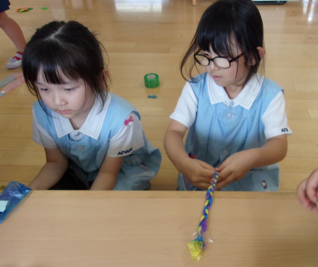 最近、年長組であるものが流行っています。それはスズランテープを使って「三つ編み」をすることです!以前制作をしたことがきっかけで女の子を中心にとても流行っています(*^。^*)作った三つ編みを髪の毛につけたり、遊び方はさまざまです☆制作がきっかけでどんどん挑戦する姿はとても素敵です💓