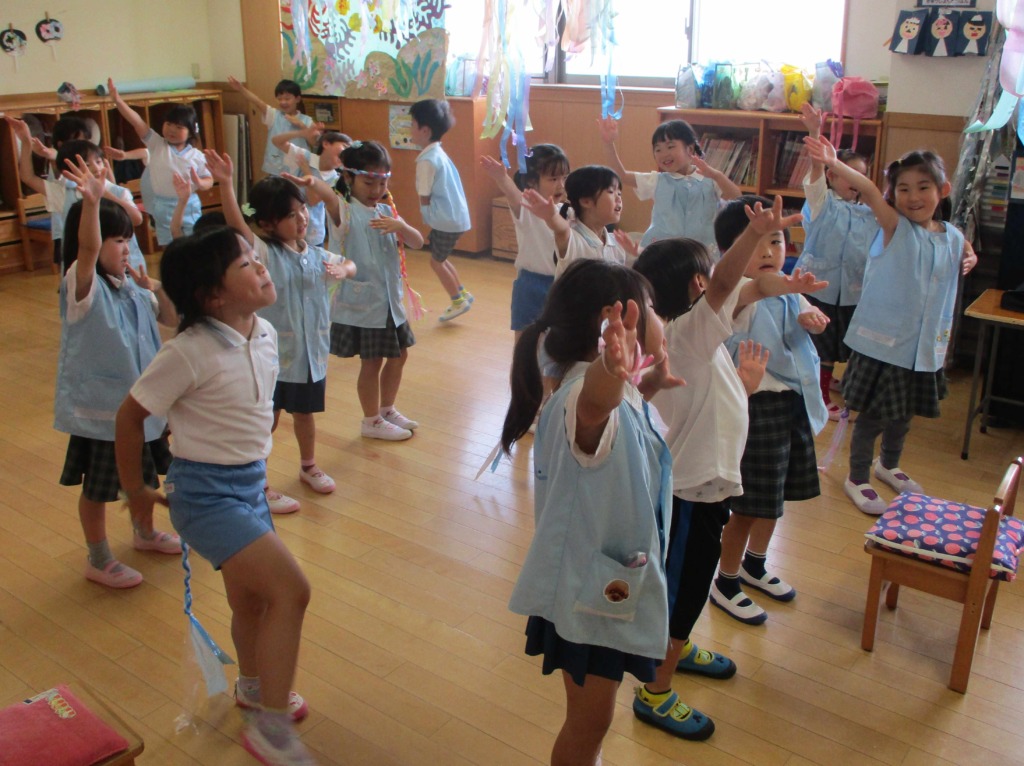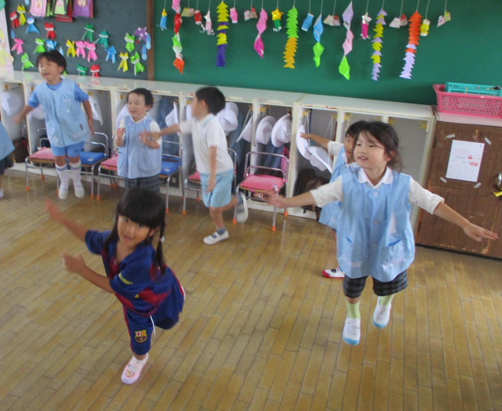 7月の星まつりに向けて各クラスで盆踊りの練習が日々おこなわれています(*^-^*)全部で3曲ありますが、徐々に踊りも覚え、楽しそうに踊っています♬僕も入らせてもらい踊っています(*’▽’)