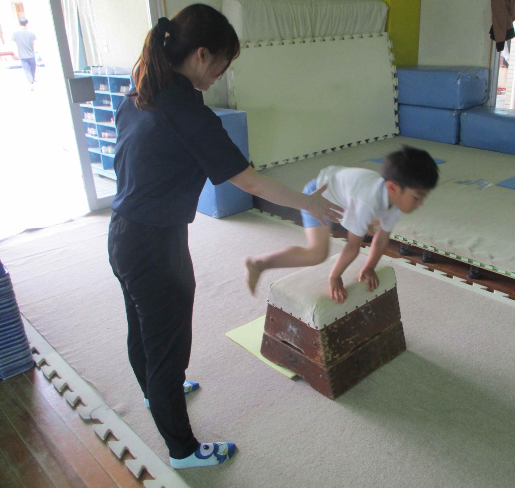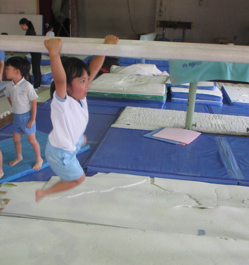 リズム室では年長組がサーキットをおこなっていました。サーキットとはたくさんの種目をどんどん回って自分のペースで練習していく遊びです(*^。^*)鉄棒に、跳び箱、マットに平行棒まで、様々な動きを織り交ぜ体を動かしています!(^^)!