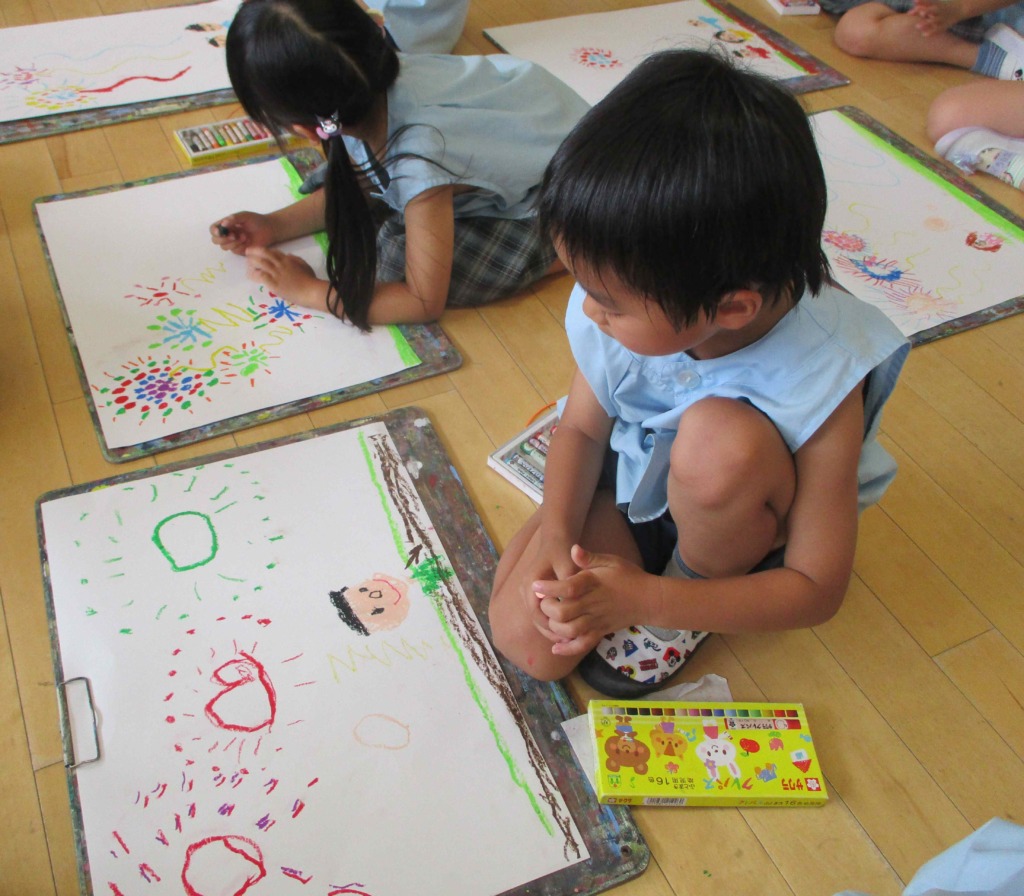 プール以外でもクラスでは様々なことがおこなわれていました(*^-^*)絵を描いたり、ふれあいあそびをしたり、どのクラスも熱心に取り組んでいましたよ☆
