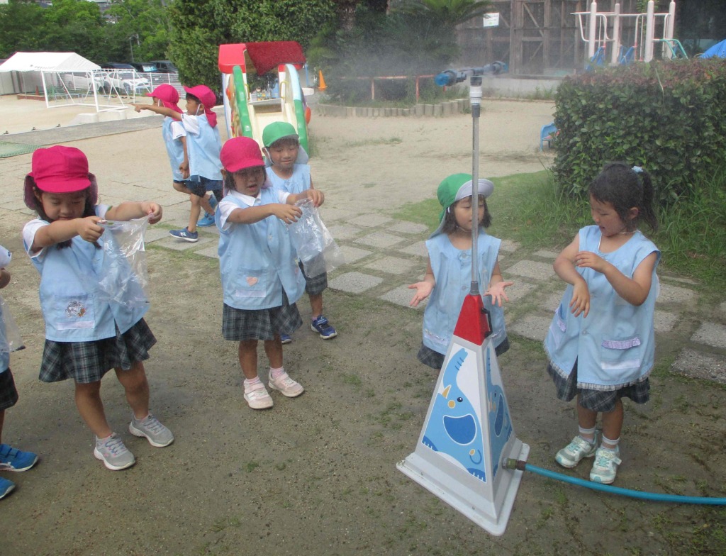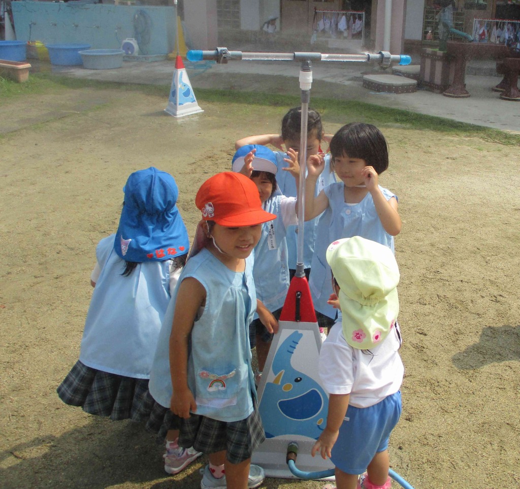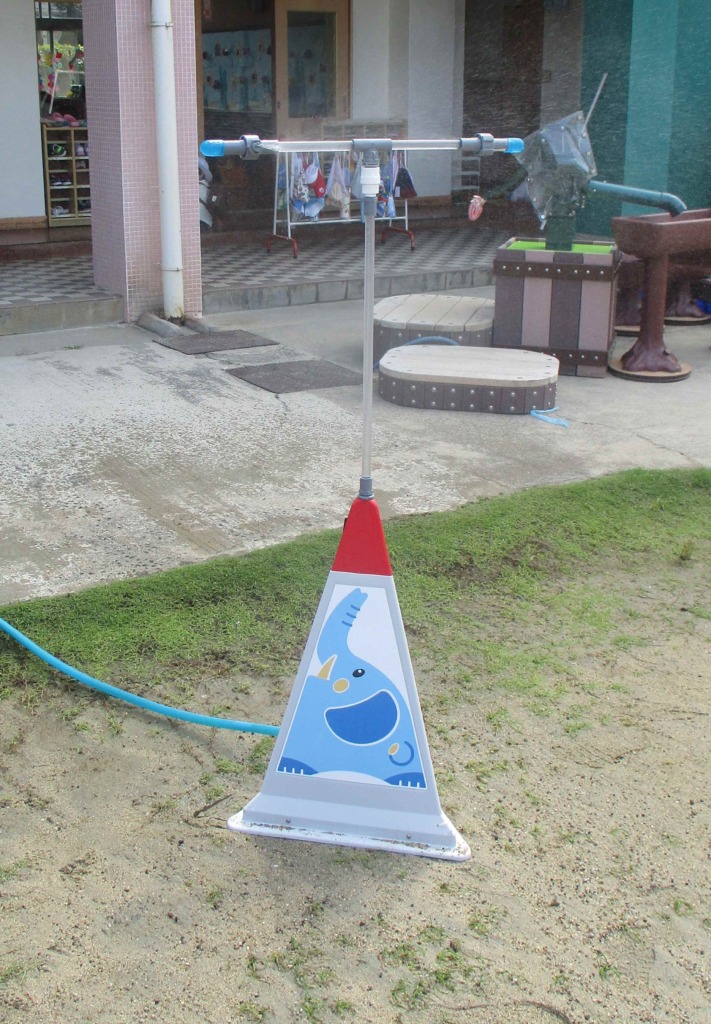 昨日ブログで紹介した道具をさっそく使いました♬上のパイプが水を出しながら回転し、ミストがでる暑い夏にピッタリの道具です。後援育友会さんに購入していただきました。ありがとうございました(*^-^*)