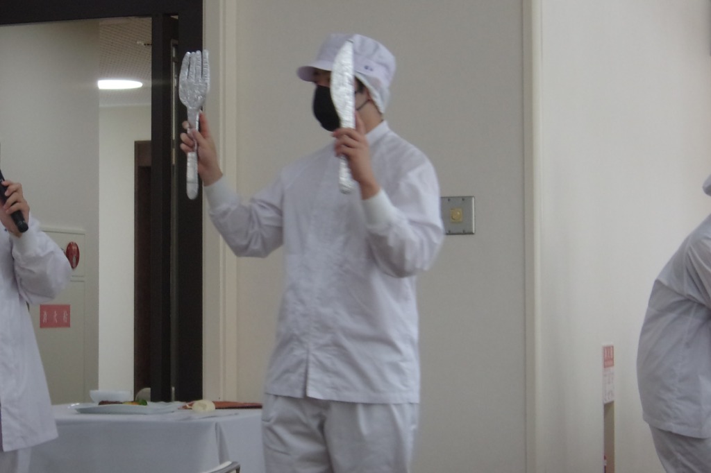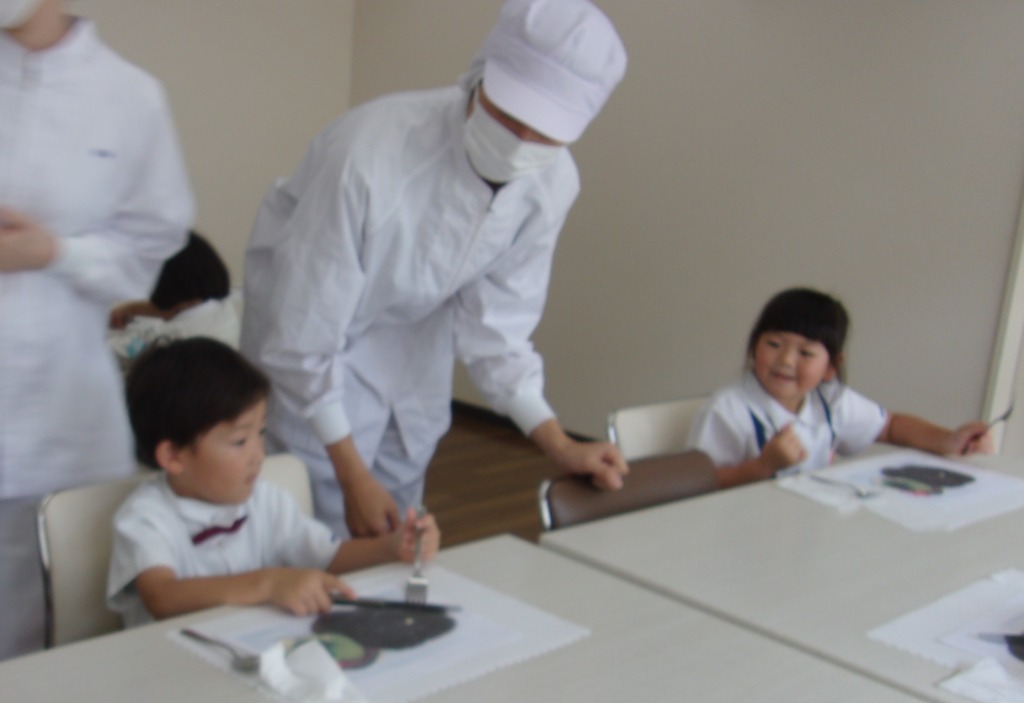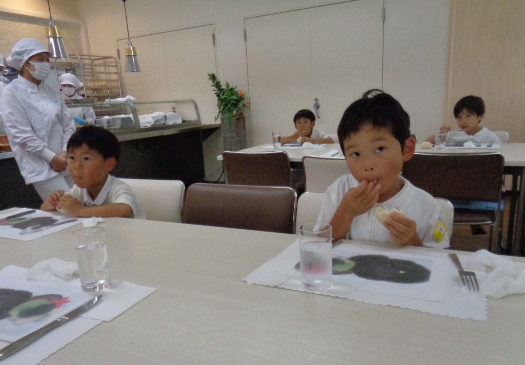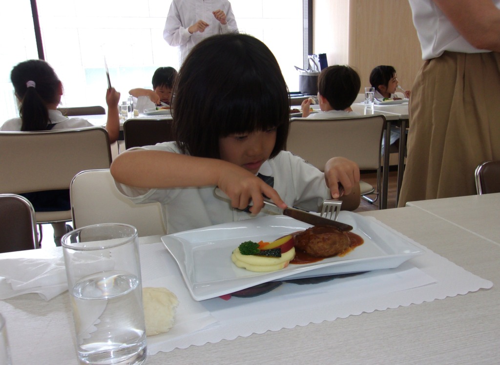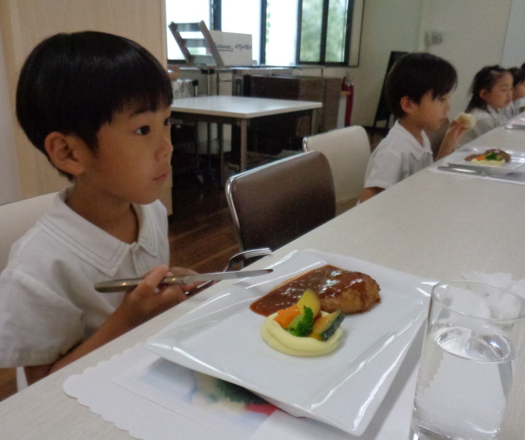 お話を聞きながら上手にナイフとフォークを使ってハンバーグをいただきました。